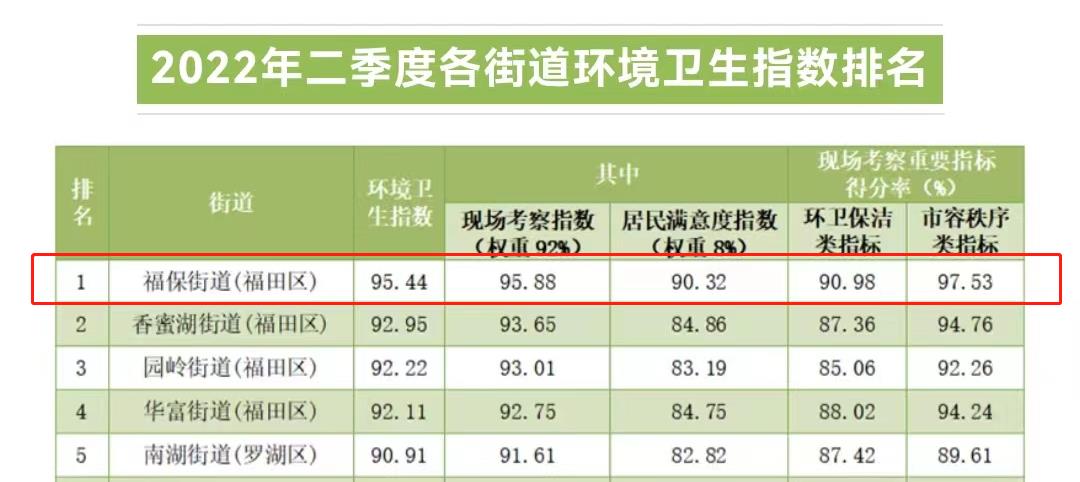 2022年第二、第三季度(第一季度因疫情暂停环境卫生指数测评)继续独占鳌头,领跑深圳全市。