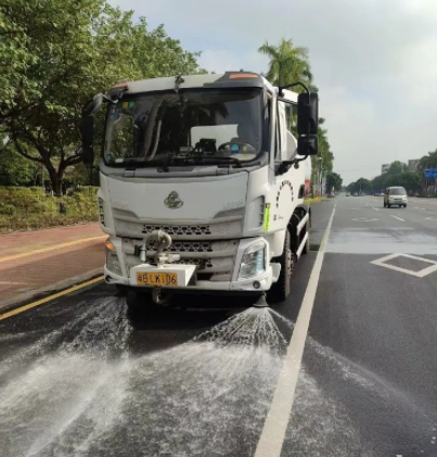 为进一步美化城区环境,全面提高路面洁净度,环卫工人对道路用扫帚反复清扫,利用环卫高压冲洗车冲洗。清扫、清洗与保洁管理力争做到“五净”、“七扫”、“六清”、“五捡”。