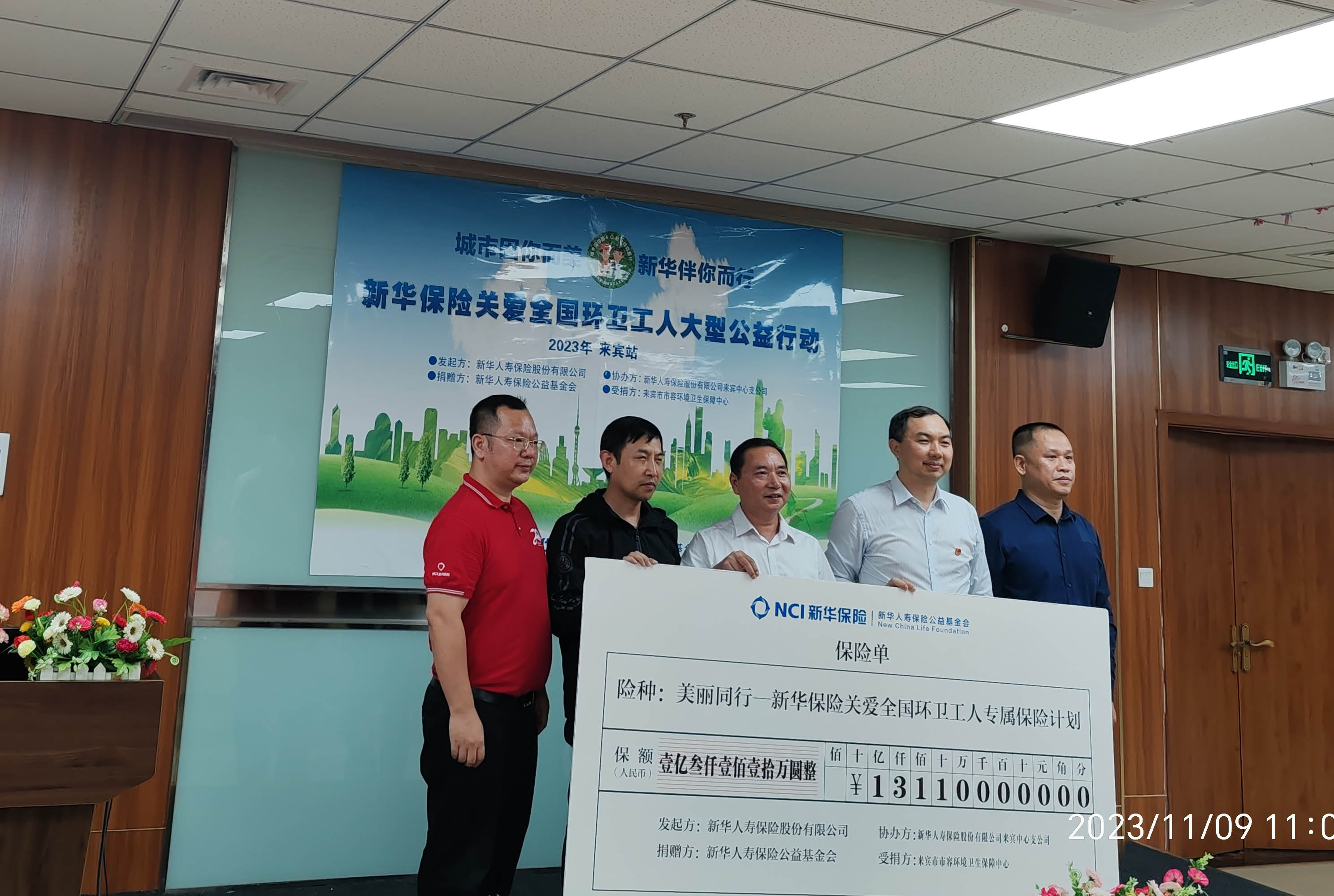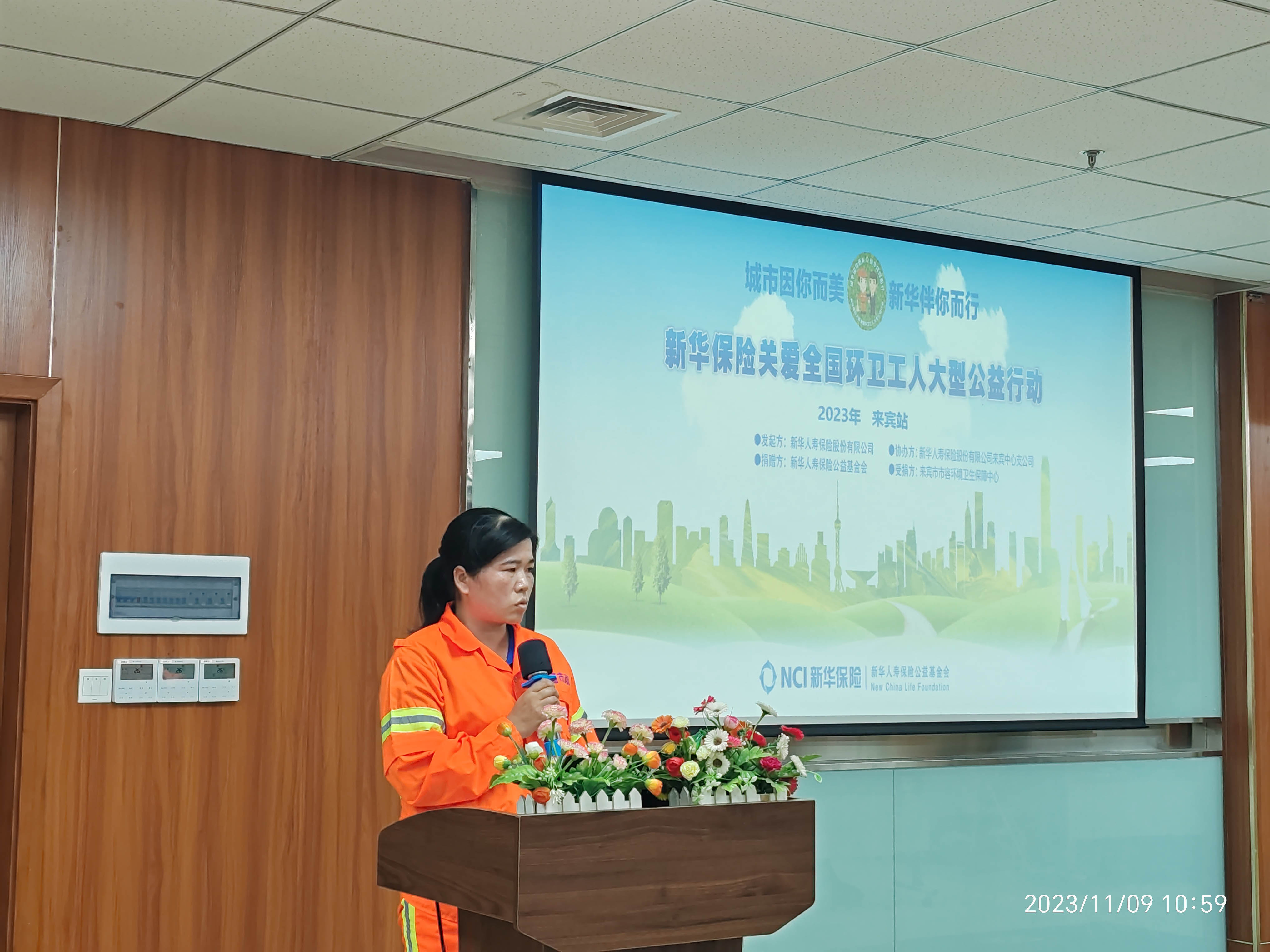 近日,我司广西来宾项目受邀参与2023年新华保险关爱全国环卫工人大型公益行动(来宾站)捐赠活动。我司来宾项目员工韦小玉代表环卫工人发言,充分诠释我司发挥“宁愿一人脏、换来万人洁”的奉献精神。
