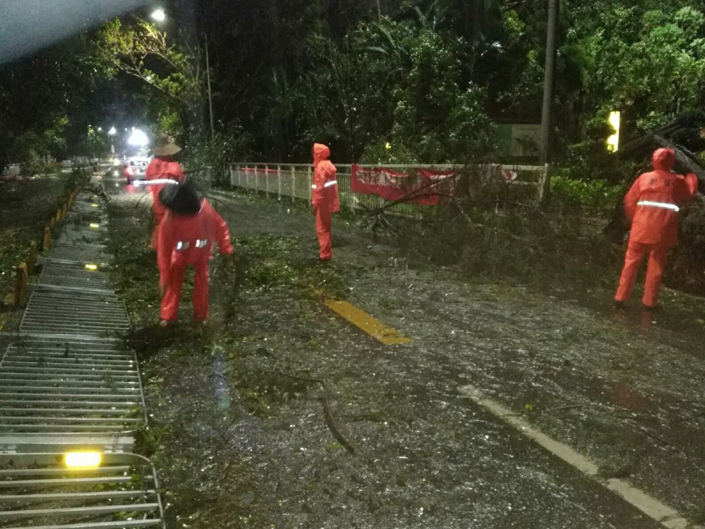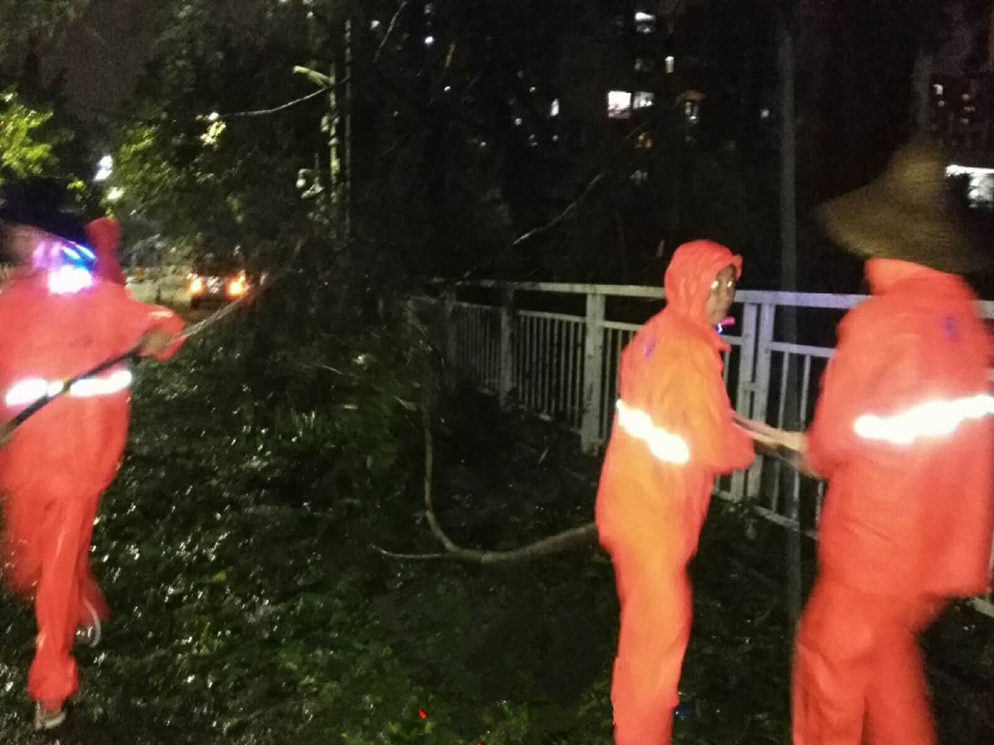 16日晚,“山竹”登陆后远去,风力逐渐减小,我司环卫工人第一时间对受灾严重路段进行道路清理。